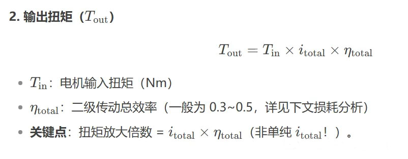 警告:計算扭矩必須按 η_total=0.3~0.4 選型,否則可能帶不動負載!