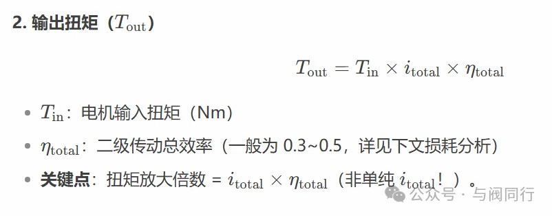 警告:計算扭矩必須按 η_total=0.3~0.4 選型,否則可能帶不動負載!